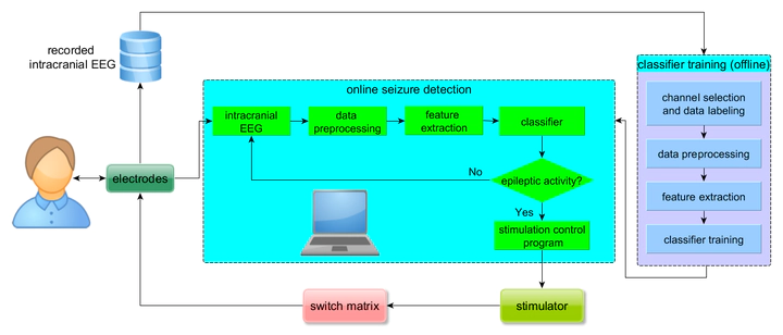 This project aimed at a realization of closed-loop interventions in a clinical setup with patients undergoing intracranial long-term EEG recordings. Main milestones were the implementation of seizure detection algorithms in an online fashion, integration of detections in an online access system and realization of triggered electrical stimulations in the zone of seizure onset, assessment of sensitivity and specificity of online detections and first experiences with stimulations at the site of seizure onset.